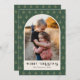 Modern and stylish, Christmas trees arch photo frame holiday greeting card in green and gold. Christmas tree design of gold squares and geometric tile pattern.