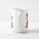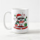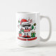 A vibrant coffee cup wears a Santa hat while holding a message that encourages joy during the holiday season. Surrounded by musical notes, ornaments, and gifts, this scene captures the essence of Christmas cheer and coffee enjoyment.