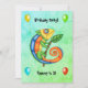 This Birthday party flat card invitation has a fantasy festive lizard in bright colours holding a leaf on a stem with different coloured balloons on a green and blue background. Customise your information on the front and back with the templates.