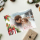 This charming Christmas card features festive watercolor illustrations of Christmas greenery and gifts beautifully placed in the corners, framing your personalised photo. The phrase "Merry Christmas" is elegantly written in decorative script, adding a touch of holiday cheer. With space for a custom family photo, along with your family name and the year, this card is perfect for sending warm, personalised holiday greetings to loved ones. The delicate watercolor design creates a cosy and festive atmosphere, making it a wonderful keepsake for the season.