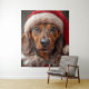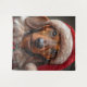The image shows an adorable dachshund dressed up in festive attire, featuring a red Santa Claus hat with fluffy white trim. The dog's large, expressive eyes and shiny black nose are the focal points of the close-up shot, creating a heartwarming and charming holiday vibe. The dachshund is also wearing a cosy red outfit with a faux fur collar, adding to the festive and warm atmosphere of the scene.