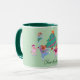 Add a dose of holiday charm to your morning coffee or tea with our "Festive Dogs Ice Skating Green Christmas Two-Tone Coffee Mug." This whimsical design showcases a playful watercolor and gouache illustration of six adorable dogs—including a pink poodle, Old English Sheepdog, corgi, Labrador retriever, and dachshund—joyfully ice skating in a magical winter wonderland.