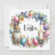 This is a festive Easter-themed illustration. The central elements include: a cute, brown bunny, a collection of pastel-coloured Easter eggs, various flowers and foliage, a lit candle in an ornate holder, a ribbon bow and a butterfly, further enhancing the celebratory and whimsical atmosphere.