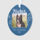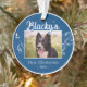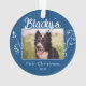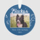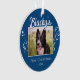 Festive First Christmas Puppy Foliage Blue Photo Ornament. Lovely white foliage and a custom dog name in a trend script. Personalise the ornament with your dog`s photo, name and year of birth - insert your favourite puppy photo. You can use this custom ornament for any pet. A lovely holiday keepsake for a dog owner.
