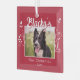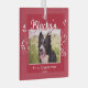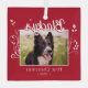 Festive First Christmas Puppy Foliage Red Photo Glass Ornament. Lovely white foliage and a custom dog name in a trendy script on a red background. Personalize the ornament with your dog`s photo, name and year of birth - insert your favorite puppy photo. You can use this custom ornament for any pet. A lovely holiday keepsake for a dog owner.