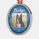 Festive First Christmas Puppy Photo Foliage Blue Metal Ornament. Lovely white foliage and a custom dog name in a trend script. Personalize the ornament with your dog`s photo, name and year of birth - insert your favorite puppy photo. You can use this custom ornament for any pet. A lovely holiday keepsake for a dog owner.