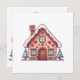 An adorable gingerbread house decorated with hearts and snow, surrounded by pine trees.