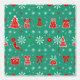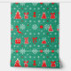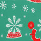 Whimsical Christmas pattern with red and white decorations, snowflakes, gift boxes, stockings, and trees on a green background. This joyful design is perfect for wrapping paper, festive crafts, or holiday-themed products, bringing a classic and playful seasonal charm.