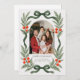 Share your holiday cheer with this elegant watercolor photo card featuring hand-painted greenery, red berries, and festive bows. Perfect for family photos, newlyweds, or couples sending Christmas greetings. Personalize with your family name and message for a warm, timeless holiday touch.