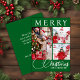 Spread holiday cheer this season with this classically festive green and white personalised Christmas card, featuring three of your cherished family photos on the front. Adorned with the word "MERRY" across the top and "Christmas" in a classic script across the bottom alongside your family name. On the back, customise the message to share a heartfelt, editable Christmas greeting, perfectly tailored to express your unique holiday wishes. Add your first names below the message to add a personal touch, creating a keepsake that friends and family will treasure. This card is the perfect blend of tradition and personalisation, making it an unforgettable way to spread holiday cheer.