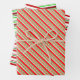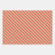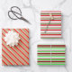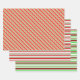 These festive Christmas and holidays style wrapping paper sheets designs feature striped patterns having colours like red, white, and green. Wrapping paper sheets like these might be used when wrapping gifts being given to celebrate Christmas.