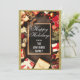 Festive Happy Holidays Christmas card with a sparkly gold glitter sparkles border and red gifts with bows surrounding a black chalkboard on rustic brown wood. This card features the words "Happy Holidays" in an elegant hand lettered script, and your family surname in white.