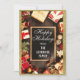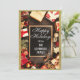 Festive Happy Holidays Christmas card with a sparkly gold glitter sparkles border and red gifts with bows surrounding a black chalkboard on rustic brown wood. This card features the words "Happy Holidays" in an elegant hand lettered script, and your family surname in white.