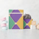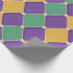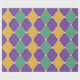 A vibrant harlequin-style pattern featuring alternating purple, green, and gold diamonds connected by small beige dots. This bold and lively design adds a sense of celebration and energy.