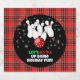 This festive holiday bowling beer labels features bowling pins with red glitter and a red bowling ball with snowflakes pattern on a cheerful red plaid background the perfect design to spread seasonal fun and party cheer.