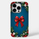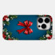 Festive, holiday-themed design featuring a rich blue background framed by lush green holly leaves. The corners are adorned with an array of Christmas decorations, including shiny red and white baubles and clusters of red berries. In the centre, there is a prominent, glossy red bow that adds a striking focal point to the composition. The overall aesthetic is cheerful and vibrant, evoking a sense of celebration and holiday spirit.