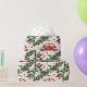 Festive wrapping paper showcases a vintage red car surrounded by pine branches and bright red ornaments, creating a joyful atmosphere perfect for holiday gift-giving celebrations.