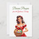 Festive Easter greeting card featuring an italian woman wearing a red dress with white lace trim. She is holding a wicker basket filled with colourful, decorated Easter eggs. The text at the top of the image reads "Buona Pasqua" in elegant green script, which is Italian for "Happy Easter."