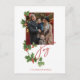 Colourful and festive holiday design featuring single photo template bordered with green and red holly branches and berries, custom handwriting style calligraphy "joy" script in red and editable text fields on front. Back features optional holly graphic, photo and editable text fields.