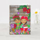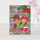 Merry Christmas card with a hand drawn whimsical male and female elf, holiday candies and a pine and Poinsettia border and a cute hand drawn little stocking with a teddy bear sticking out.These little elves have darker skin to represent Hispanic or African-American kids.