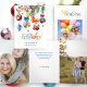 This is a bright, colourful and unique holiday greeting featuring four festive Christmas ornament-shaped photo templates hanging from a watercolor pine branch. Also featured is a cheery multicolored Merry Christmas text graphic in a custom decorative font. Includes editable text fields. The panels feature additional text fields, complementary Happy Holidays text graphic and floral and three additional photo templates.