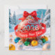 Festive New Year 2026 holiday ornament in a snowy winter wonderland, featuring a shiny red bauble with gold and silver swirls, adorned with a big red bow and surrounded by colourful Christmas ornaments. Perfect cheerful holiday greeting scene.