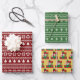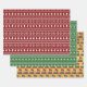 Set of 3 colourful, festive Christmas wrapping paper sheets. Red with a pattern of white snowflakes and Christmas trees, kelly green with a pattern of snowflakes and gold foil with stacks of green, red and white Christmas presents.