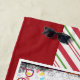 A beach towel with a photo of a sweet pug puppy sleeping while wearing a red santa hat. Merry Christmas is written on the band of his hat, in a trendy handwritten font. A black grunge border with colourful holiday lights surround the frame of this adorable photo. The background is a festive candy cane striped pattern in red white and green. Customisable text at the bottom says: Peace Joy and Pugs.