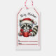 A cute racoon wears a Santa hat, holding a red mug filled with marshmallows. The tag wishes Merry Christmas, perfect for adding a cheerful touch to holiday gifts.
