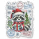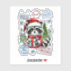 A charming racoon, dressed in a Santa hat, holds a beautifully wrapped gift. Surrounded by festive stickers and snowflakes, the scene evokes the joyful spirit of Christmas.