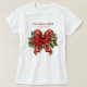 T-shirt with a festive Christmas bow in red and gold. Surrounded by poinsettia flowers, pine and Christmas decorations.