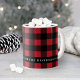 Personalize this festive Christmas coffee or hot cocoa mug with your family name or other custom text. Design features a festive and stylish modern black and red buffalo check plaid pattern with heart accent.