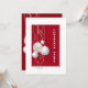 Invite your guests with this modern red, white, and gold Christmas party invitation featuring elegant gold and white ribbons and baubles. This invitation is suitable for corporate and family Christmas celebrations.