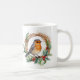 Red robin mug, personalised robin mug. Celebrate the festive season - enjoy a hot beverage in this Christmas Mug. This design features a watercolor illustration of red- breasted robin perched on a holly wreath.