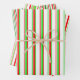 These fun Christmas inspired wrapping paper sheets designs feature stripes coloured red, white, and green. Festive wrapping paper sheets like these might be used when preparing gifts being given when celebrating Christmas.