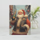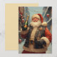 Santa Claus, dressed in a festive outfit adorned with golden snowflake accents and a traditional red hat, stands in a snowy holiday street. He holds a bottle of champagne in one hand and a glass of bubbly in the other, radiating joy and cheer. The background features decorated streets with red ornaments and sparkling lights, capturing the magical atmosphere of Christmas. Snow gently falls, adding to the festive ambiance.