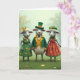 This design shows three dressed-up sheep standing close together on a soft, spring-green background, their gentle smiles and sideways glances suggesting a sweet friendship with a hint of romance 💚. The sheep in the middle wears a white fleece with an emerald tailcoat, a mustard-yellow waistcoat, and a green bow tie, topped with a leprechaun-style hat with a gold buckle. On the left, a ewe wears a green dress decorated with orange-and-yellow daisy shapes, a knitted-looking collar, and a yellow flower tucked into her curled wool as she leans in slightly. On the right, another ewe wears a terracotta-orange dress with scattered blossom details and a small green beret, angled toward the center as if sharing a private joke ☘️. The light looks like early morning, soft and diffused, smoothing the scene into a gentle blur behind them. Any greeting text sits above the trio in a light green shade, with a smaller line placed near the bottom in warm gold. Under their tiny polished shoes, a carpet of grass is sprinkled with little wildflowers in mixed colors.