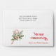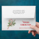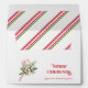 This Christmas envelope radiates festive charm with its vibrant interior liner of diagonal stripes in red, green, white, and shimmering silver—evoking the sparkle and sweetness of holiday treats. The envelope features a classic candy cane nestled among pine branches, holly leaves, and bright red berries, creating a nostalgic and cheerful vignette. The greeting, “MERRY CHRISTMAS from our house to yours,” is printed in bold red lettering that feels both heartfelt and timeless, making the entire ensemble a warm and welcoming gesture of seasonal joy.