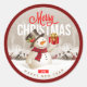 Celebrate the season with this cheerful snowman holiday sticker! Featuring a classic snowman in a top hat and red scarf, holding a festive gift against a snowy village backdrop, this circular design adds warmth and charm to any gift wrap, card, or holiday craft. With the message “Merry Christmas and Happy New Year,” it’s perfect for spreading joy and seasonal spirit. Ideal for party favors, envelopes, or personalized packaging.