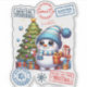 A charming snowman in a cosy blue hat and scarf enjoys a warm drink beside a beautifully decorated Christmas tree. Surrounded by colourful presents and various festive stamps, this delightful scene radiates holiday joy and cheer.