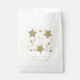 Sweet sixteen birthday party themed white paper favour bag, with graphic artwork of gold tone curled ribbon, hearts and glittery looking stars. Personalise the golden brown text for your daughter's special day. Great for candy and sweets bars, popcorn, and other favours.
