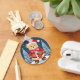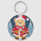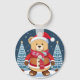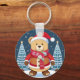 Adorable teddy bear dressed as Santa Claus with a red scarf, snowflakes falling, and two decorated Christmas trees. A joyful holiday scene celebrating Christmas spirit during winter festivities.