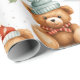 "Feel the embrace of winter with our delightful wrapping paper, featuring teddy bears in red dresses amidst a winter wonderland."