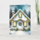 Personalised Christmas card. Cute little white festive tiny home in the winter forest.