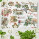 Festive, fun and unique holiday seamless pattern featuring vintage Merry Christmas greetings in decorative script with traditional floral embellishments, including holly, ribbons, angels, winter landscape vignettes, birds and red berries. White background.