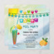 Pool party invitation featuring a cocktail with festive balloons and orange on a watercolor background. This invitation works well for both an adult party or for families and children.