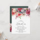 Elegant wedding invitation featuring winter florals - poinsettias, in rich shades of red, burgundy, creams and ivory, festive berries, lush greenery and accents of faux gold glitter dusting. The wedding template is combined with a combination of calligraphy script handwriting and serif fonts.