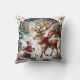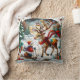 A cheerful figure on a sled interacts with a vibrant reindeer amidst a snowy landscape decorated with gifts and pine trees.