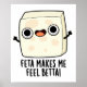 Feta Makes Me Fell Betta Funny Cheese Pun features a cute block of feta cheese declaring that feta makes him feel better . Perfect Puns gift for family and friends who love cute feta cheese puns.