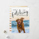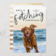 Cute Christmas photo template card featuring for dog owners featuring a typography text at the top that says "have a fetching Christmas" as a overlay text on top of your dog picture. Customise this product by adding your family name and year at the top. The back of the card is faux gold foil stripes.